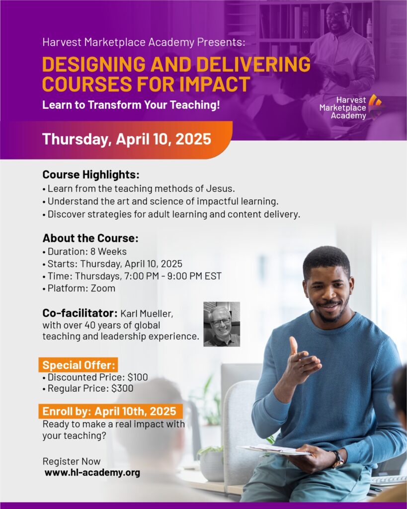 Harvest Marketplace Academy presents its powerhouse course, Designing and Delivering Courses for Impact, designed to equip you with the tools to transform your message into unforgettable, impactful learning experiences.